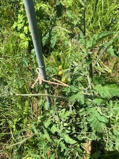 トマトの誘引(紐を支柱に絡めて強風で苗が折れないようにする)
