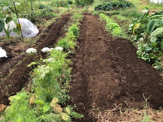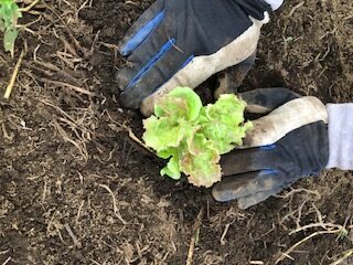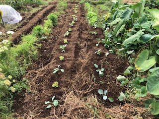 広く低めの畝には、キャベツ、サニーレタス、白菜、ブロッコリー、ロマネスコの苗を植えます。