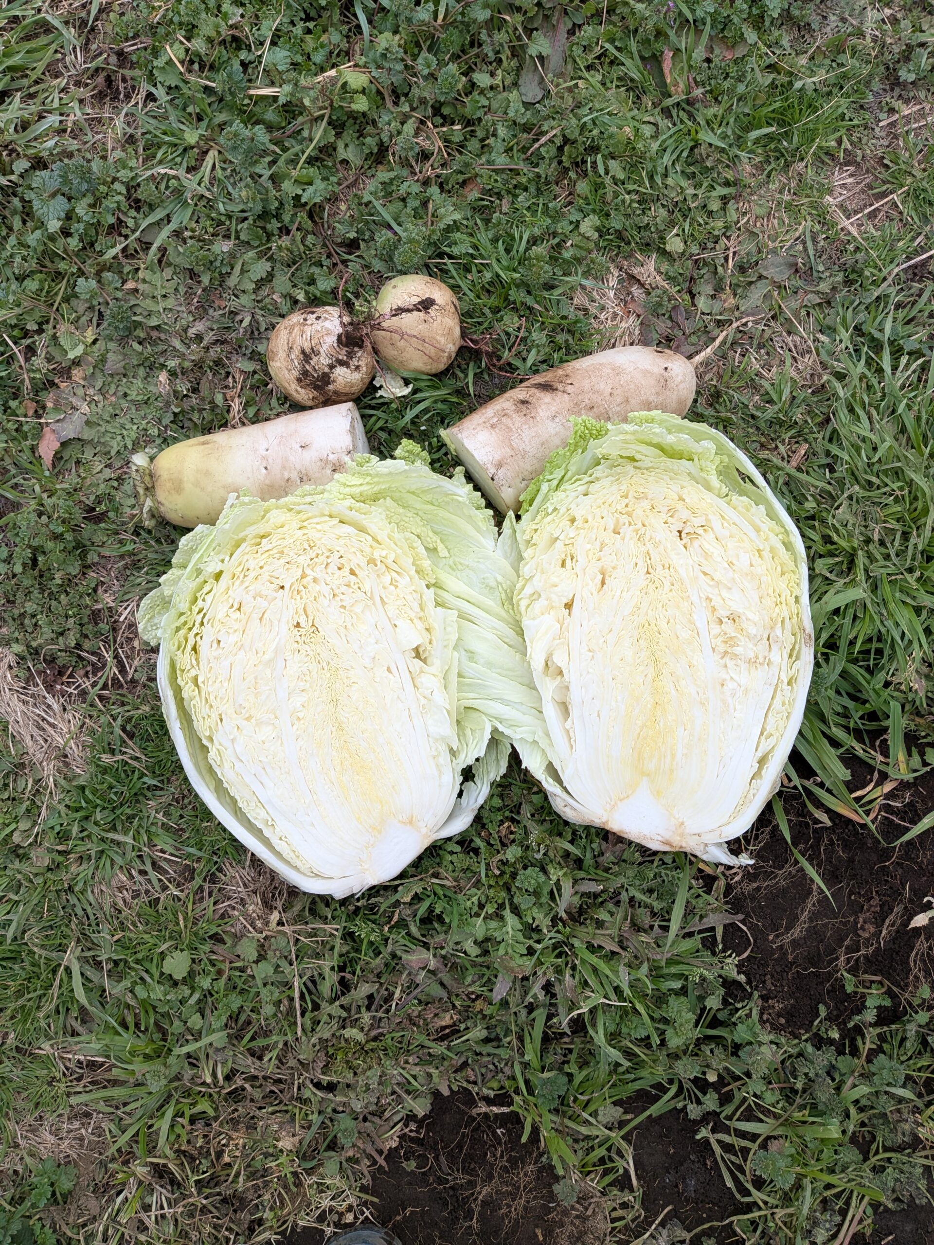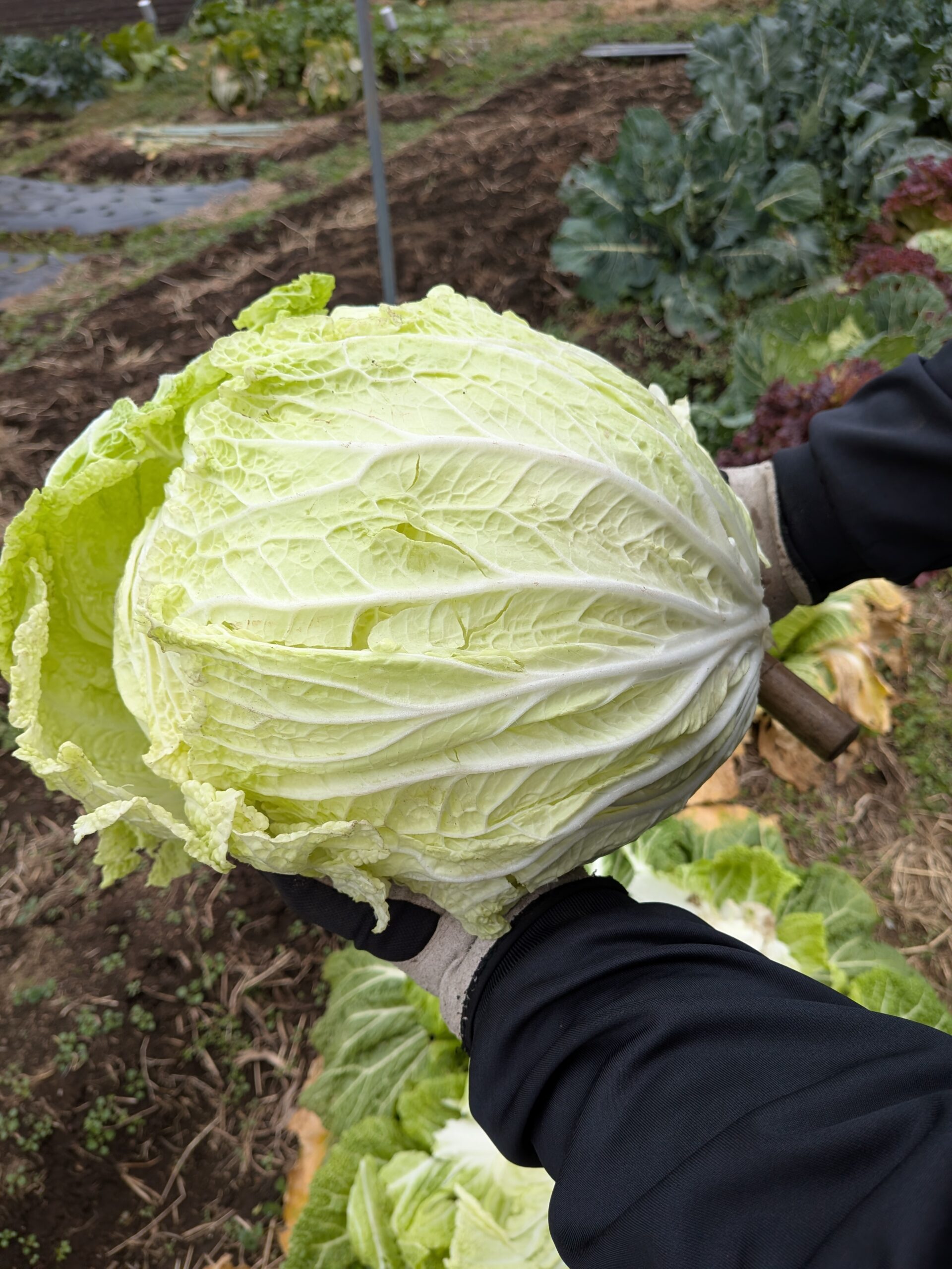 冷たい空気が頬を刺すような朝、年末用の野菜を収穫するところから作業を始めました。