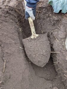 固くなった土を深く掘り返し、空気を入れ、肥料を混ぜ込み、次の野菜が育つ準備を整えます。