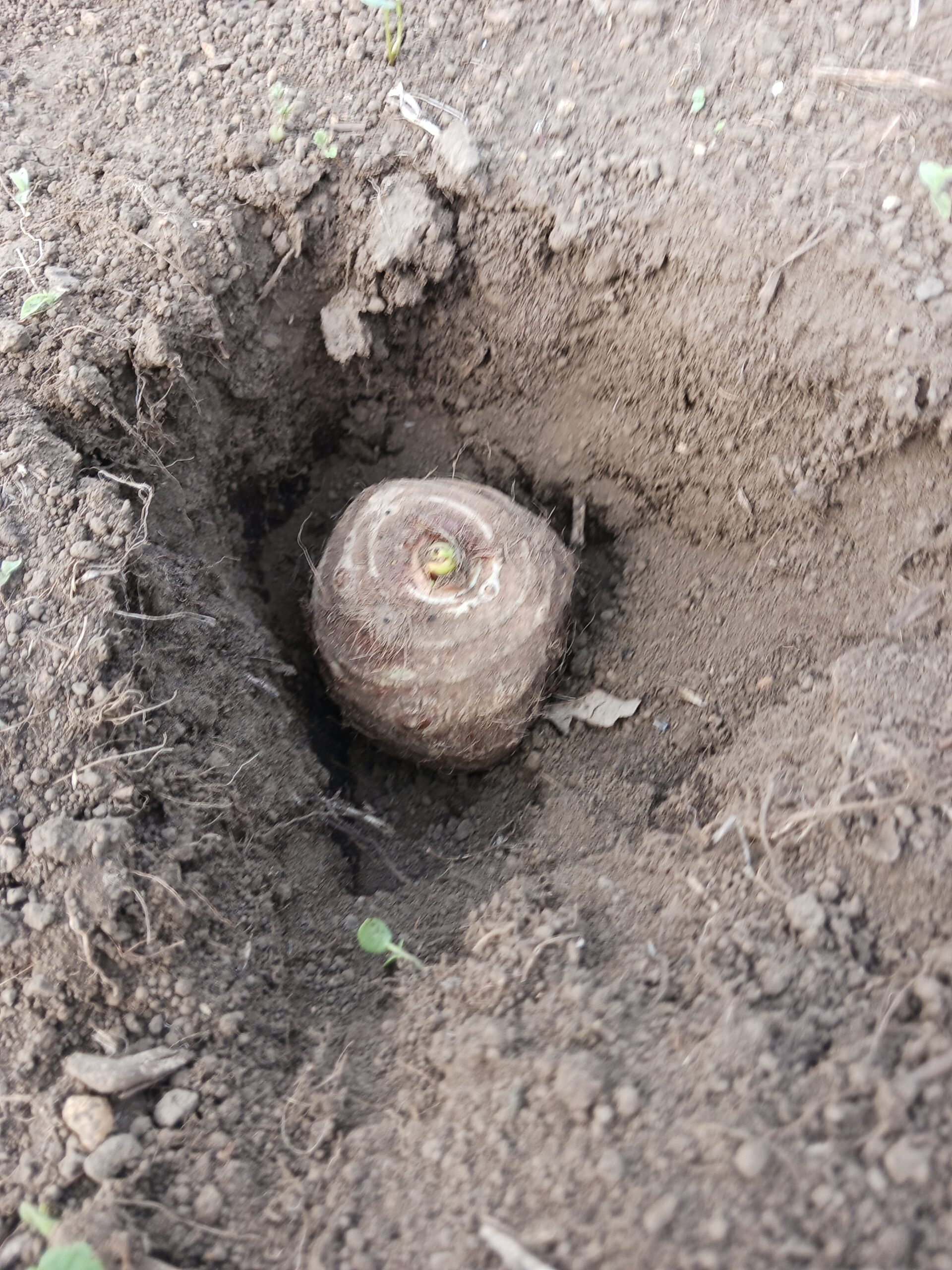 里芋のお尻を下にして、芽が上になるように植付けをしました。