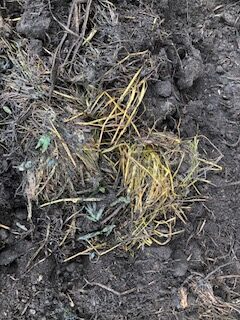 掘り返してみると、土がいつもより重く感じます、、雑草が粘り気を帯びて変色していました。