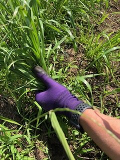 草を刈るときには、鎌で指を切らないように、草を掴んだ手の親指を決して下に向けず、空に向かって立てるようにします。