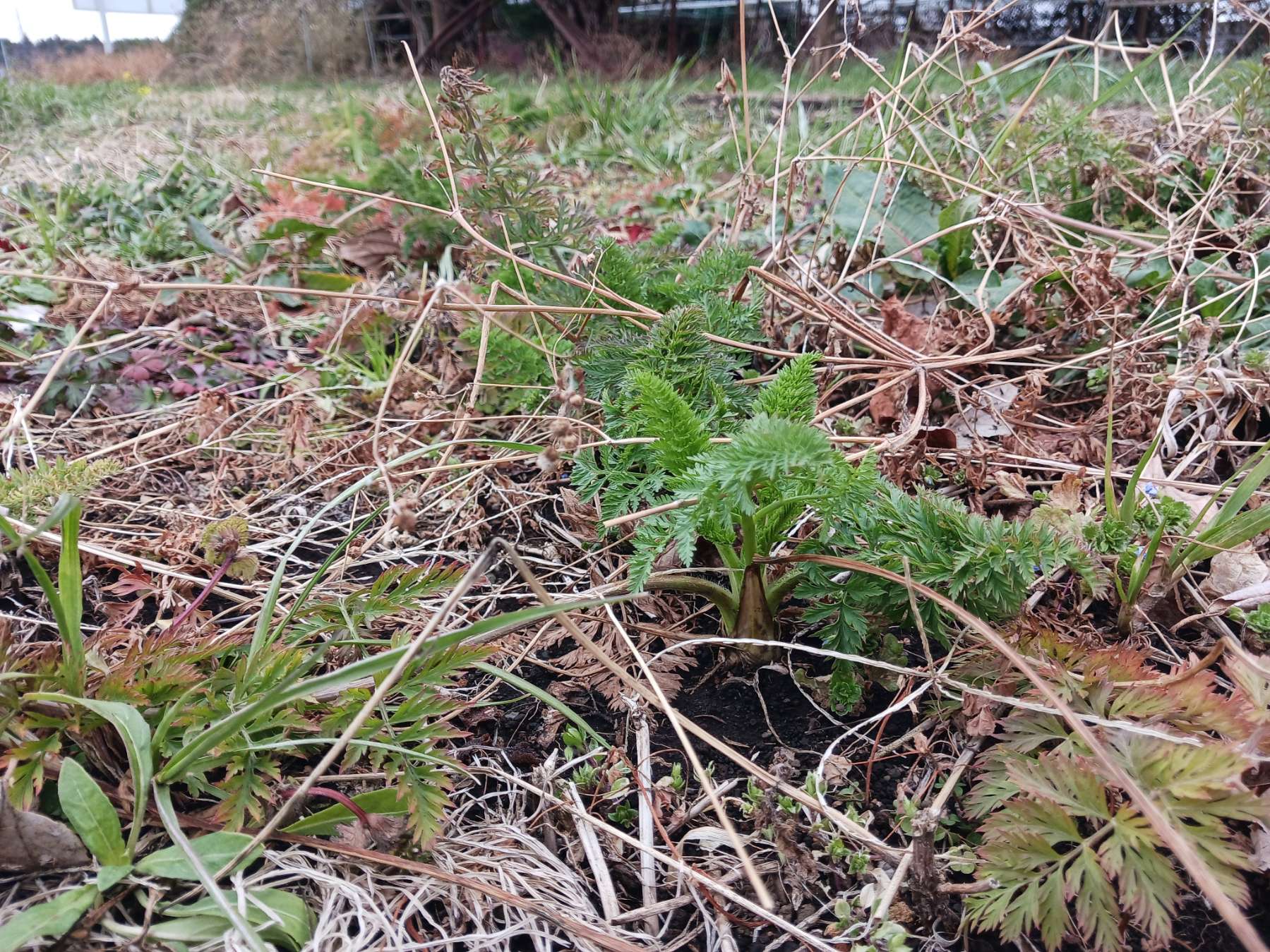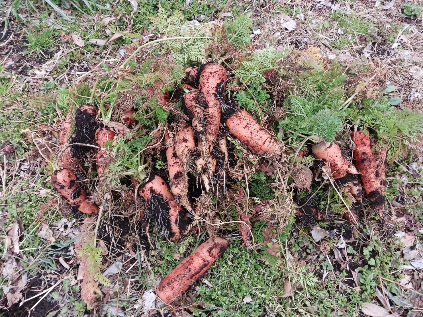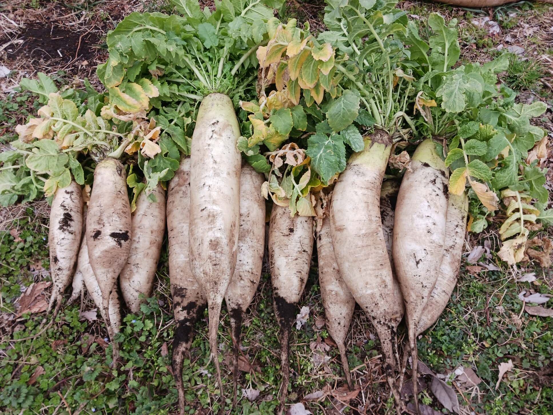 土から顔を出した大根、草の間からひょっこり頭を見せる人参。